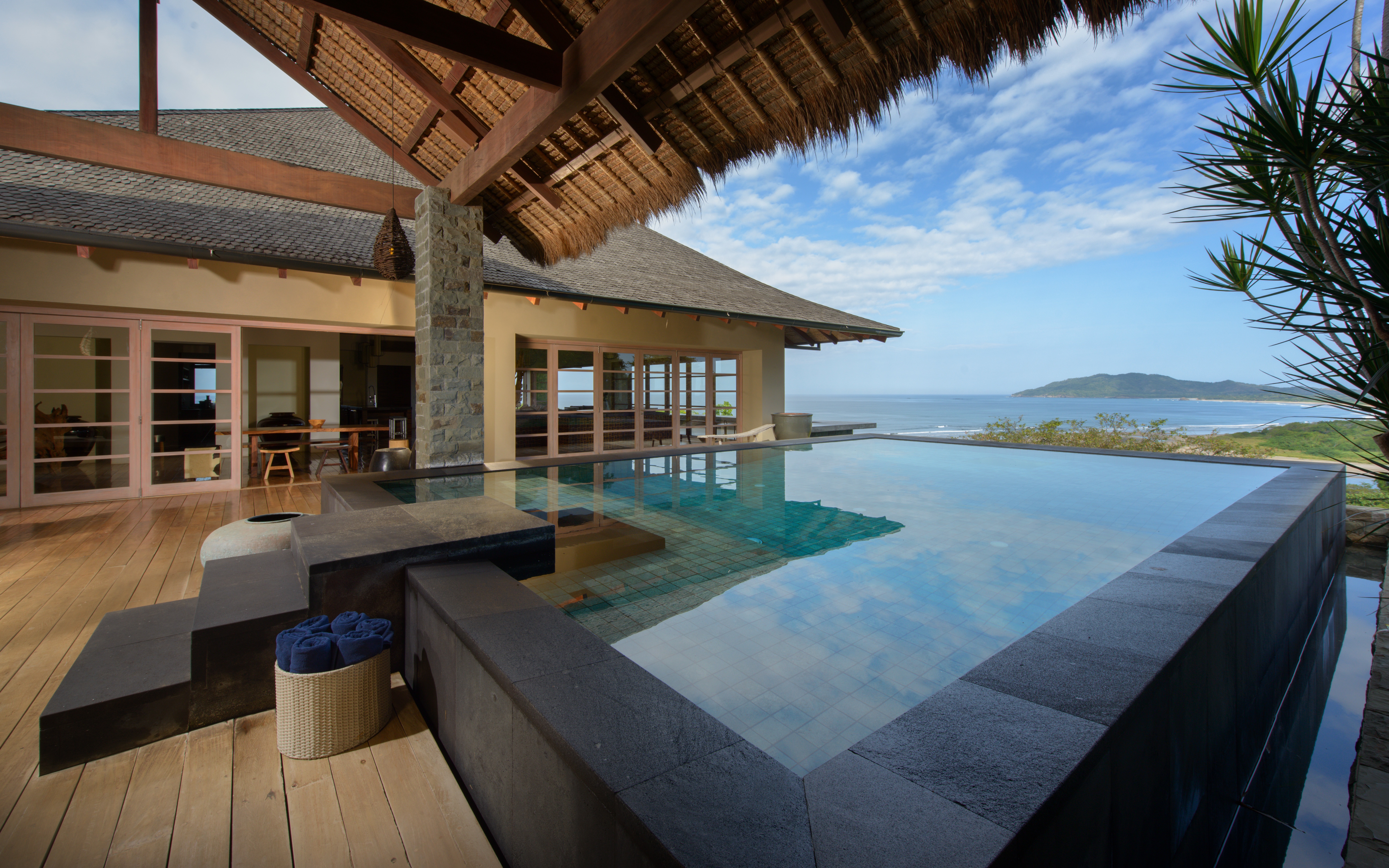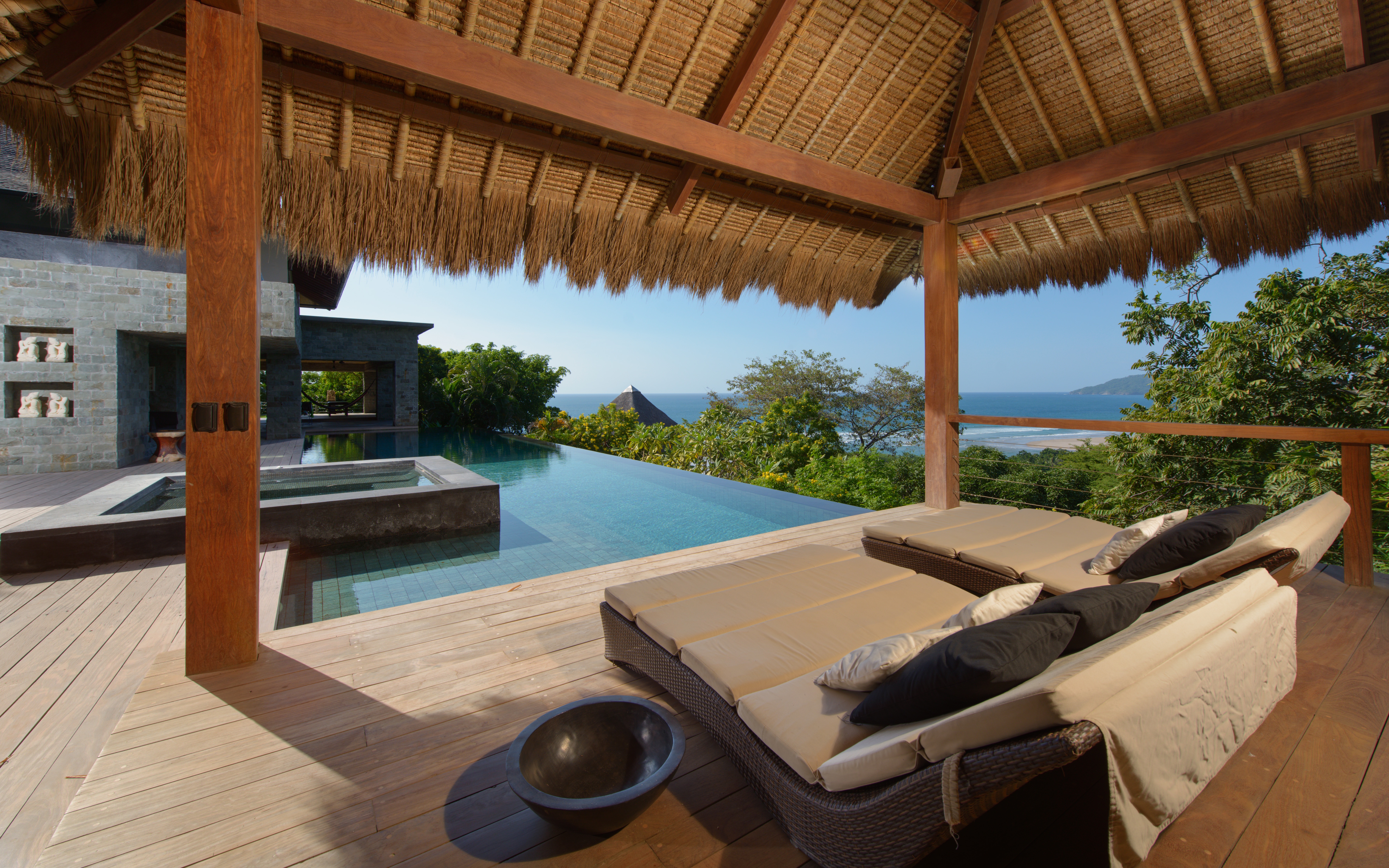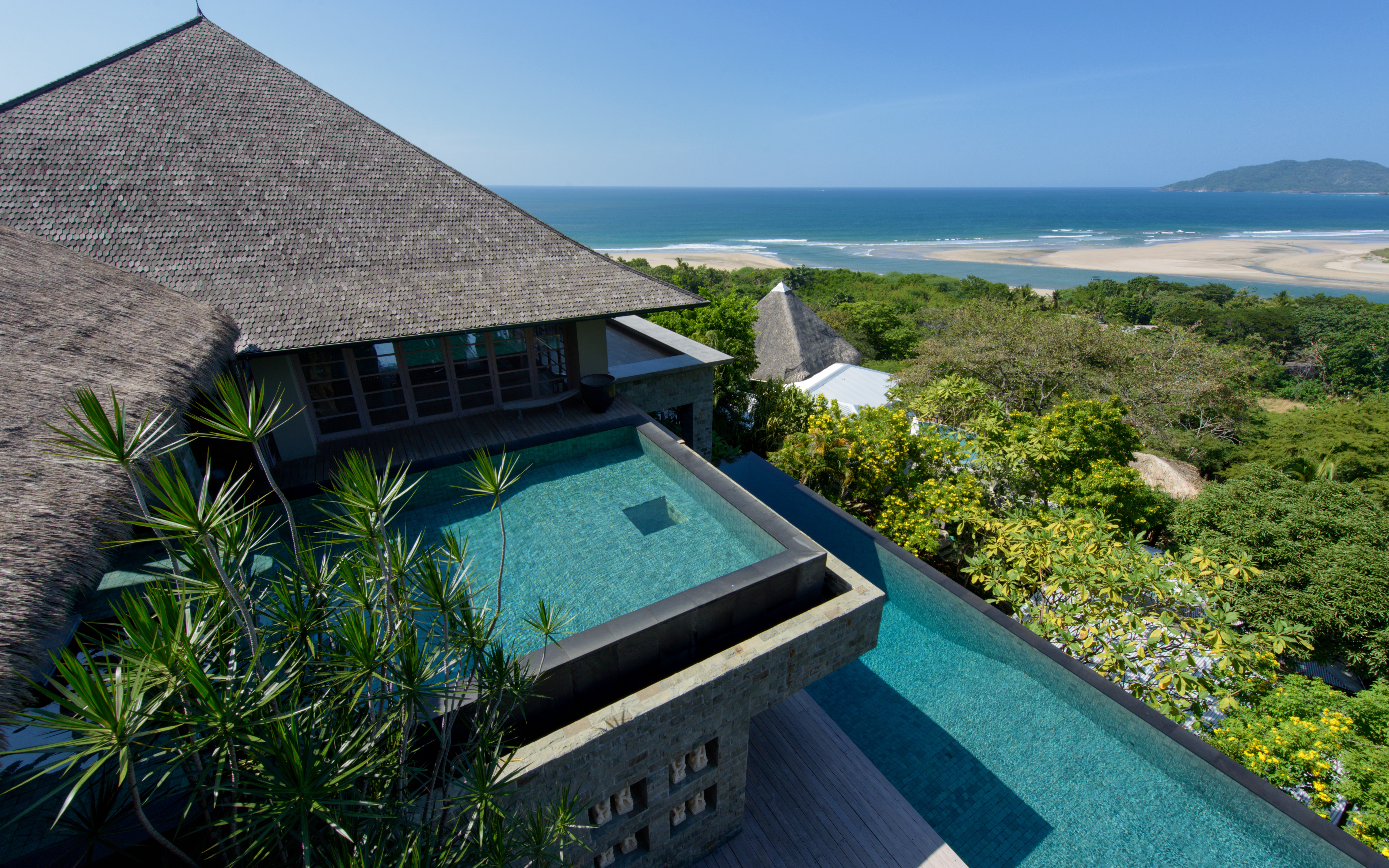 Inspired by Bali living, Casa Alang Alang is approximately 15,000 square feet and features eight bedrooms, sleeping up to 20 people in great comfort and style with a unique blend of privacy and multiple ample common areas. This luxury villa is located on a private, secluded hillside at the entrance of Tamarindo with breathtaking views of Tamarindo estuary and the Pacific Ocean all the way north to Playa Grande, yet 5 minutes walking distance to the beach and town center.