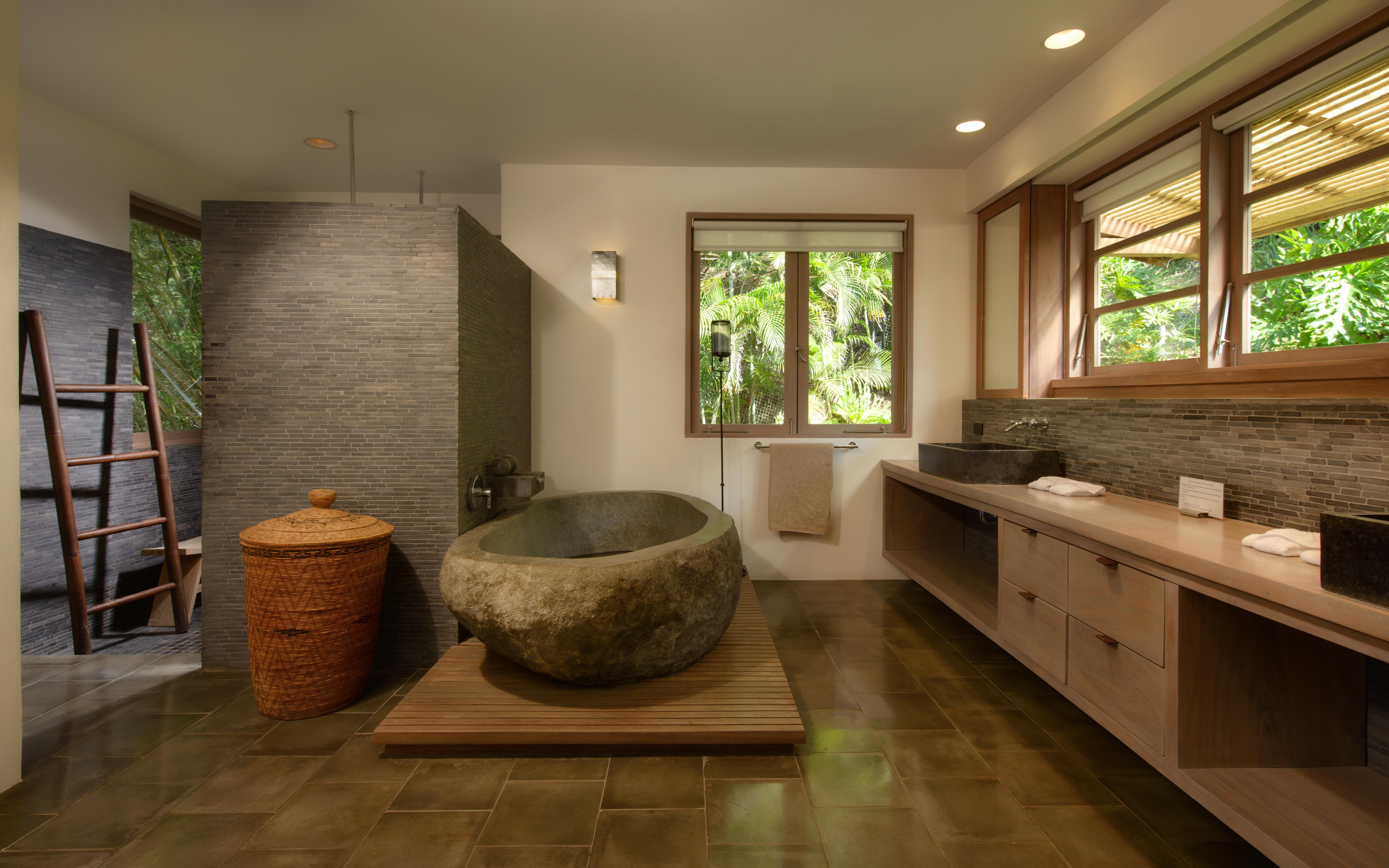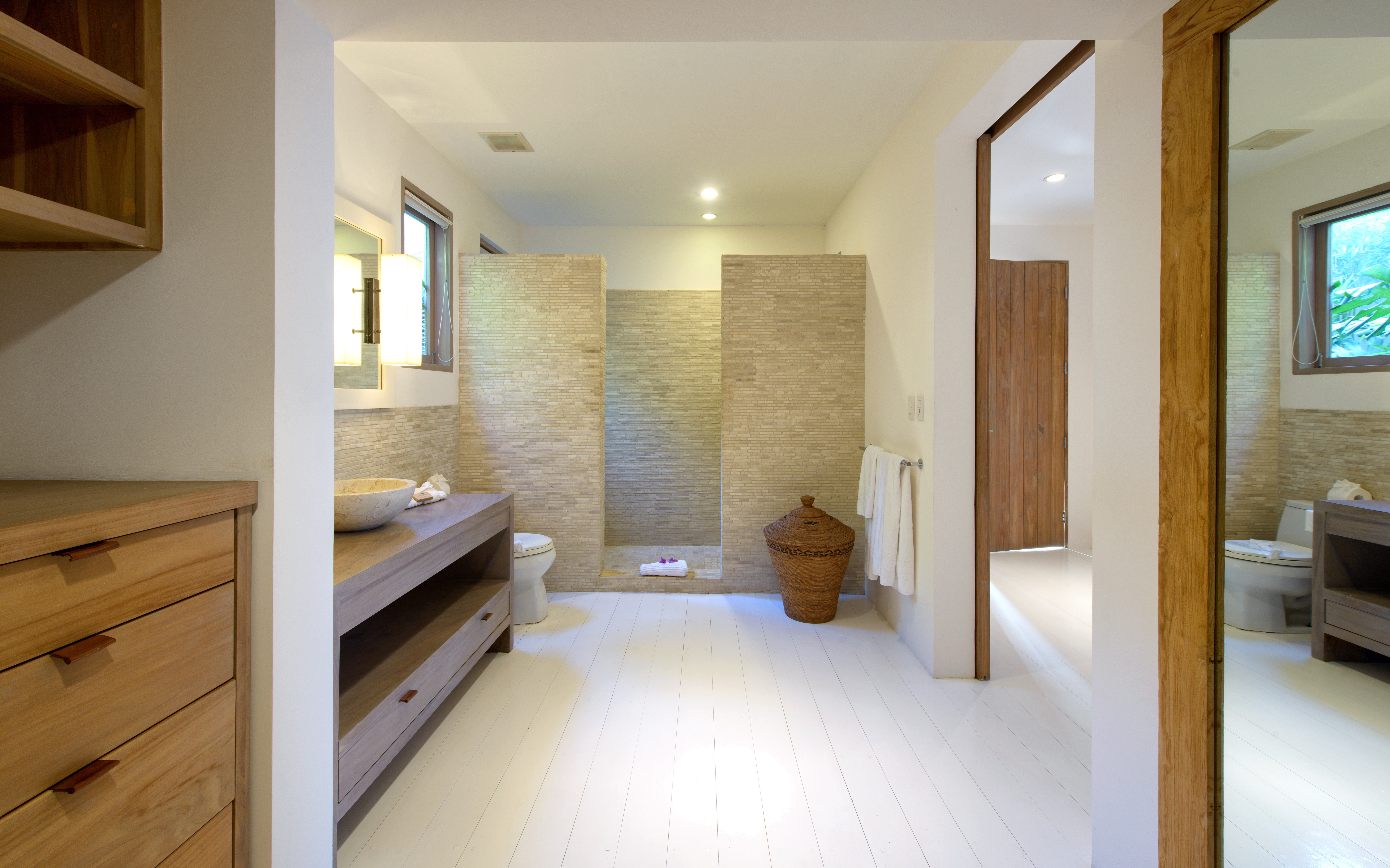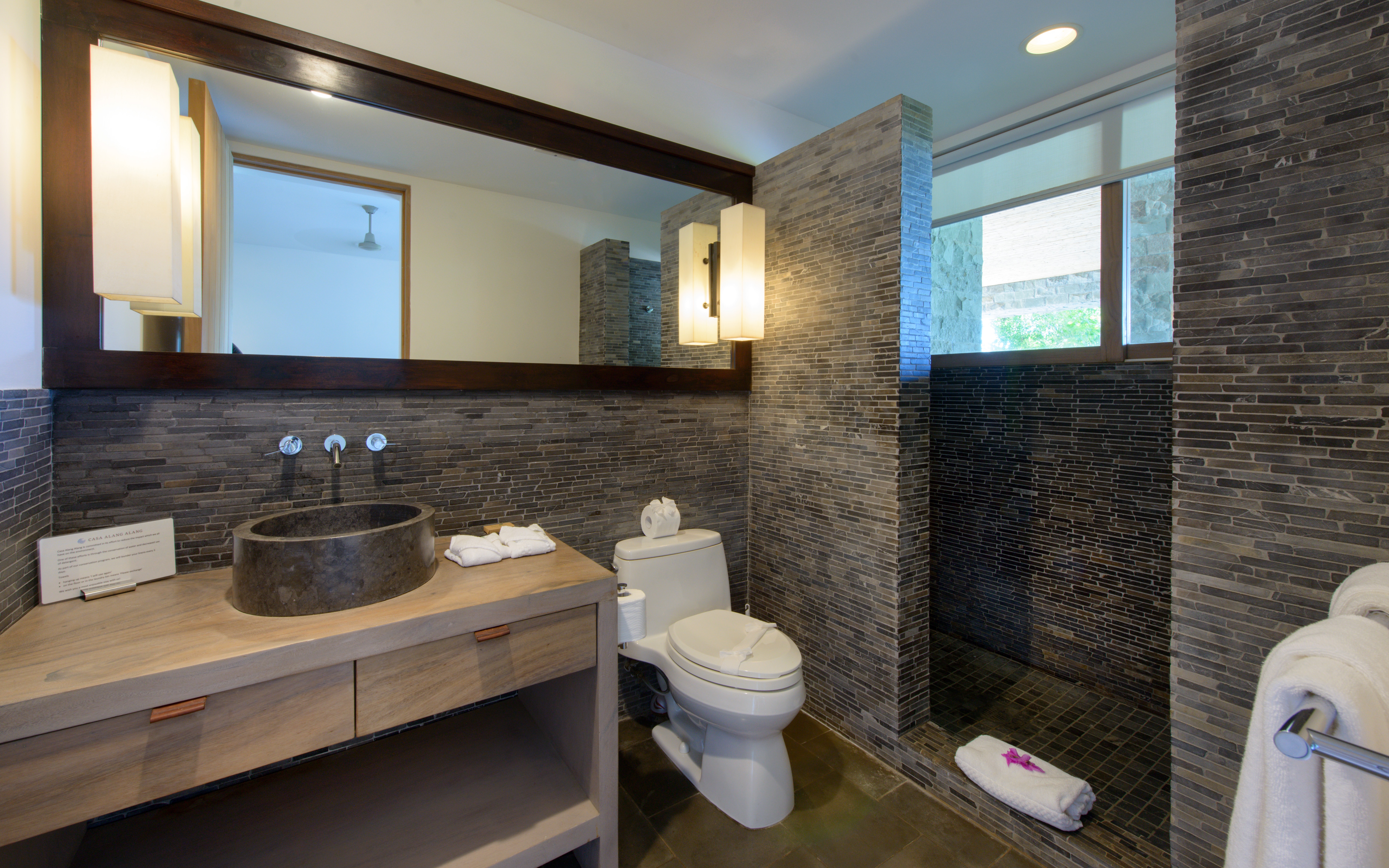 The primary bedroom is on the upper level and includes a California king-size bed, a full ensuite bathroom with double sinks, a double shower, and a beautiful carved stone bathtub.