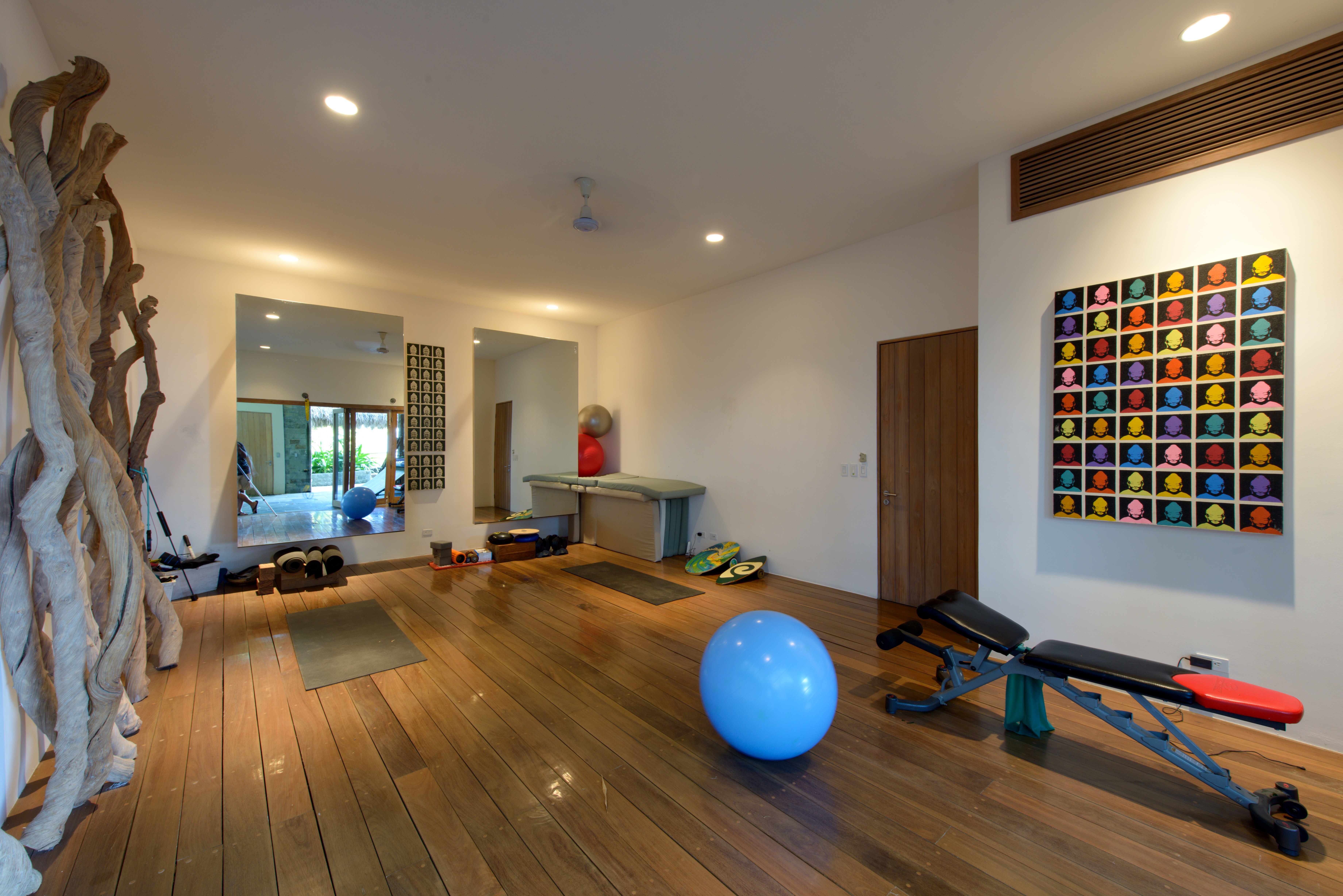 Exercise/yoga room with large mirrors, one bench, some weights, TRX, and yoga mats.