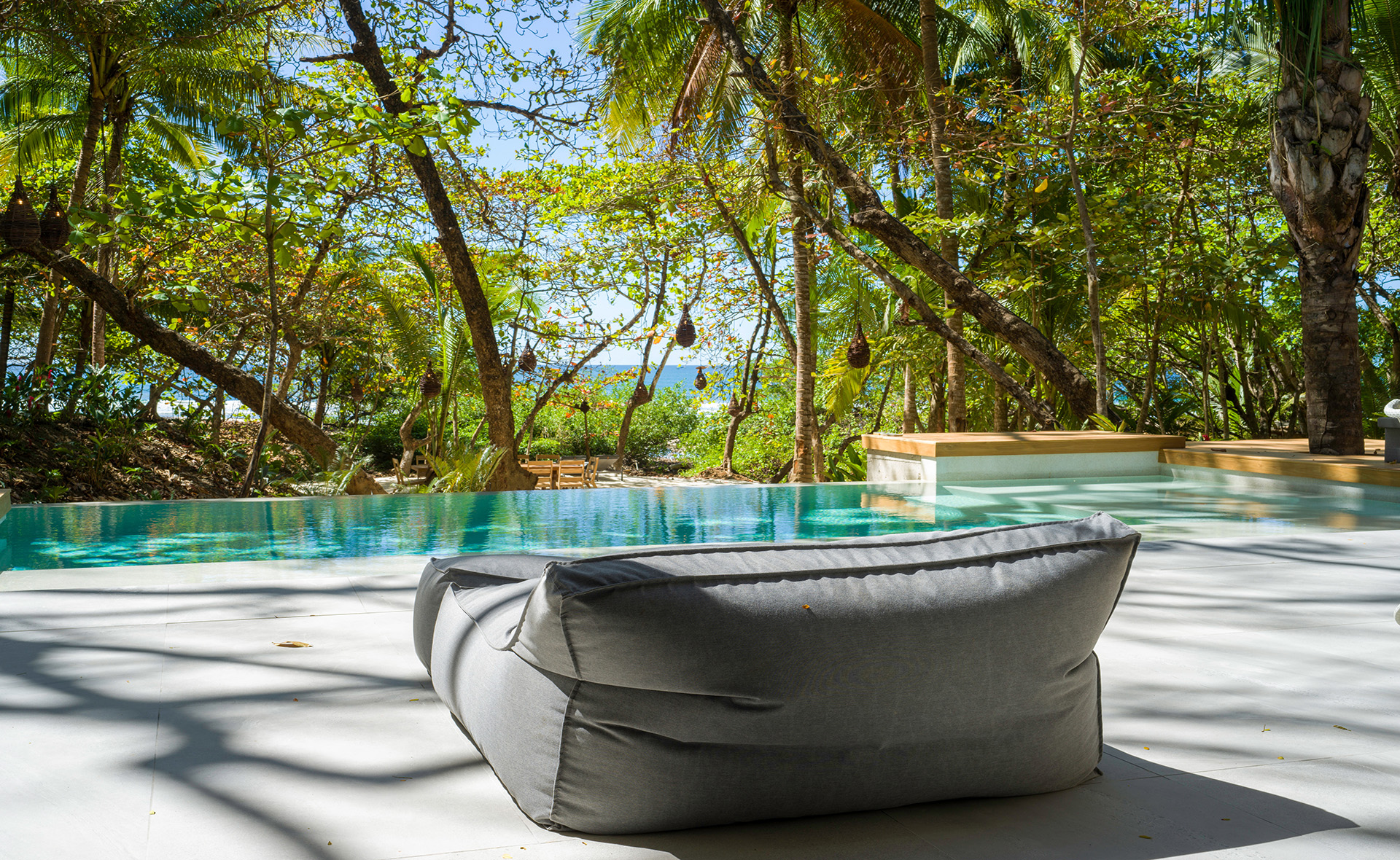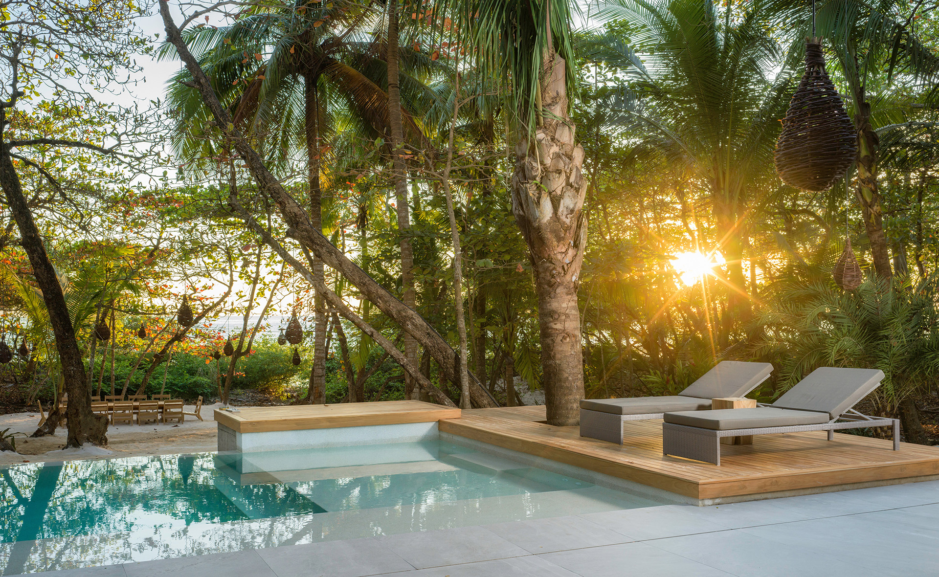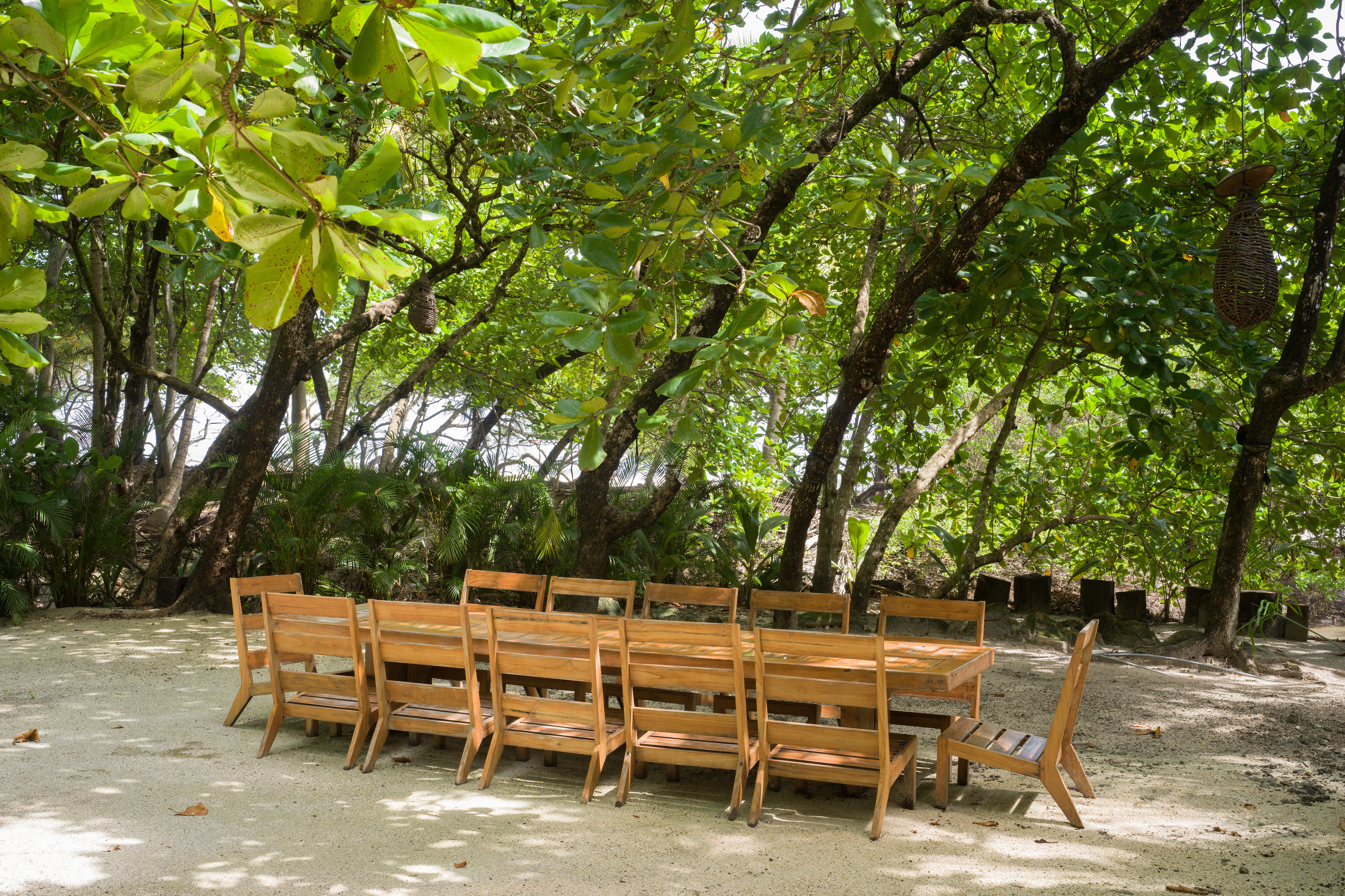The spacious area between the house and the beach is naturally shaded by native trees and includes lounge chairs and hammocks. There is a large dining table located close to the beach where guests can enjoy cocktails or dinner with an amazing tropical sunset view. The white sand beach in front of North Creek Estate is beautiful. You can relax in full privacy in the shade of numerous trees while watching some fantastic, consistent surf or one of the world’s most beautiful sunsets.