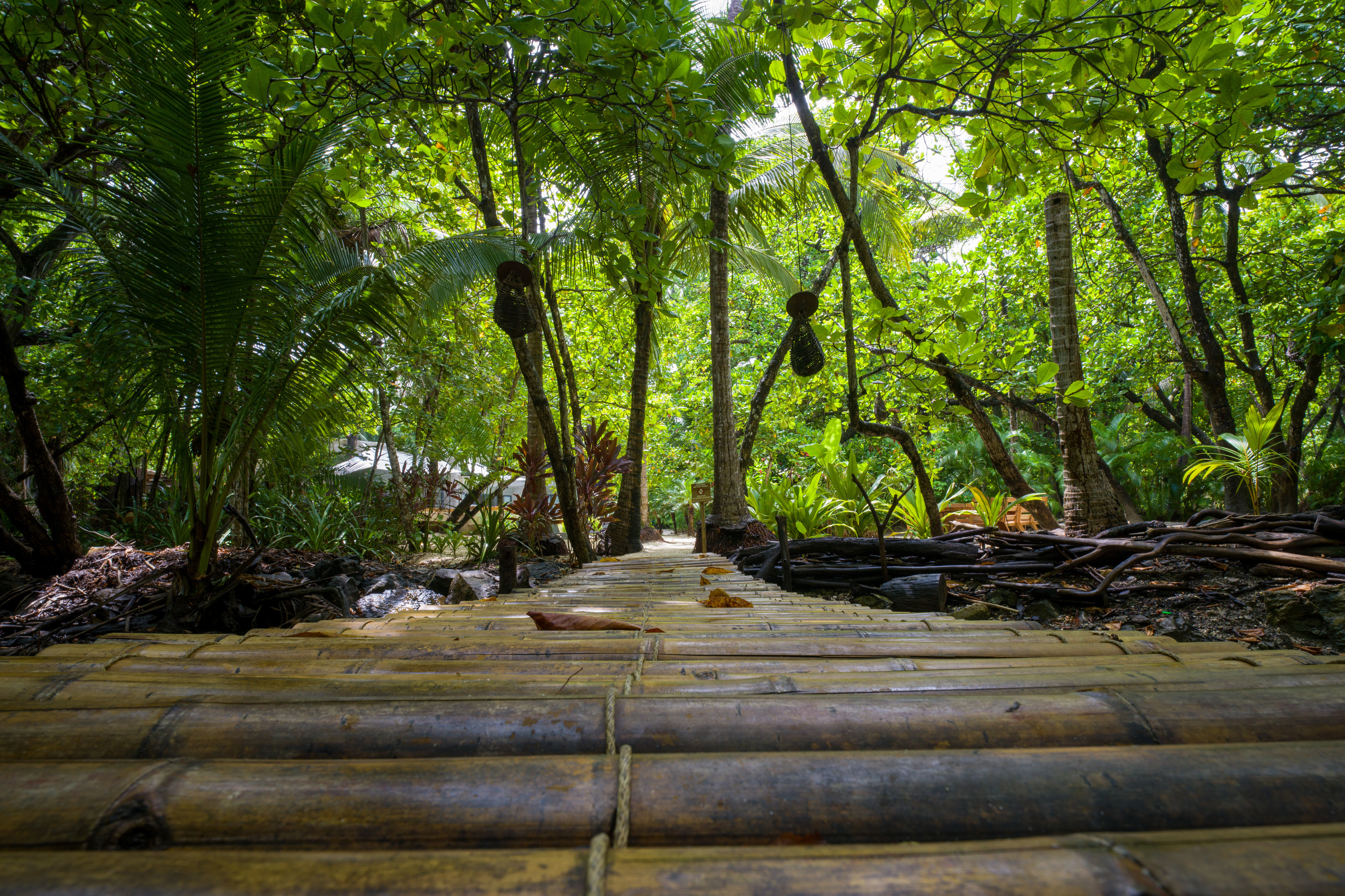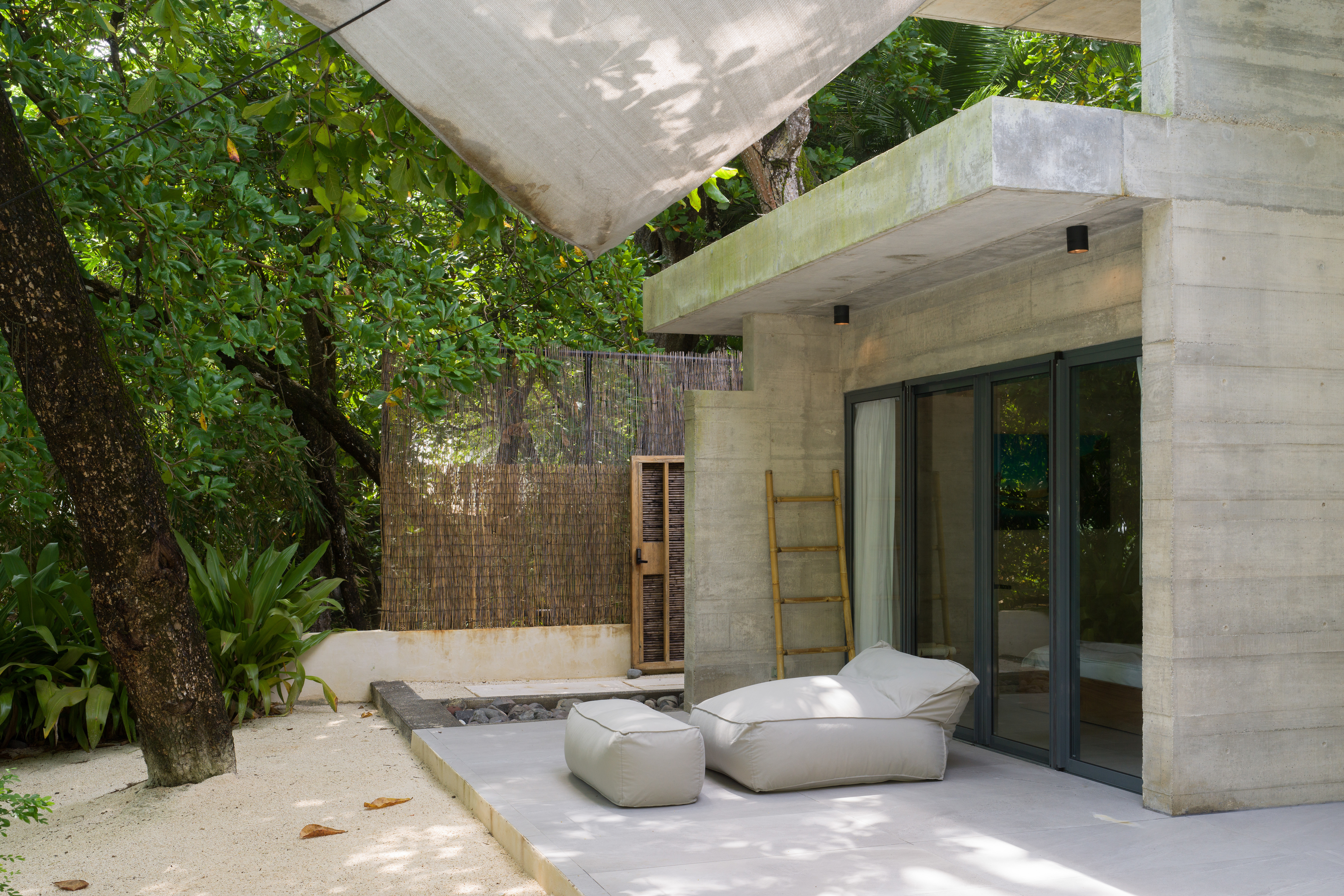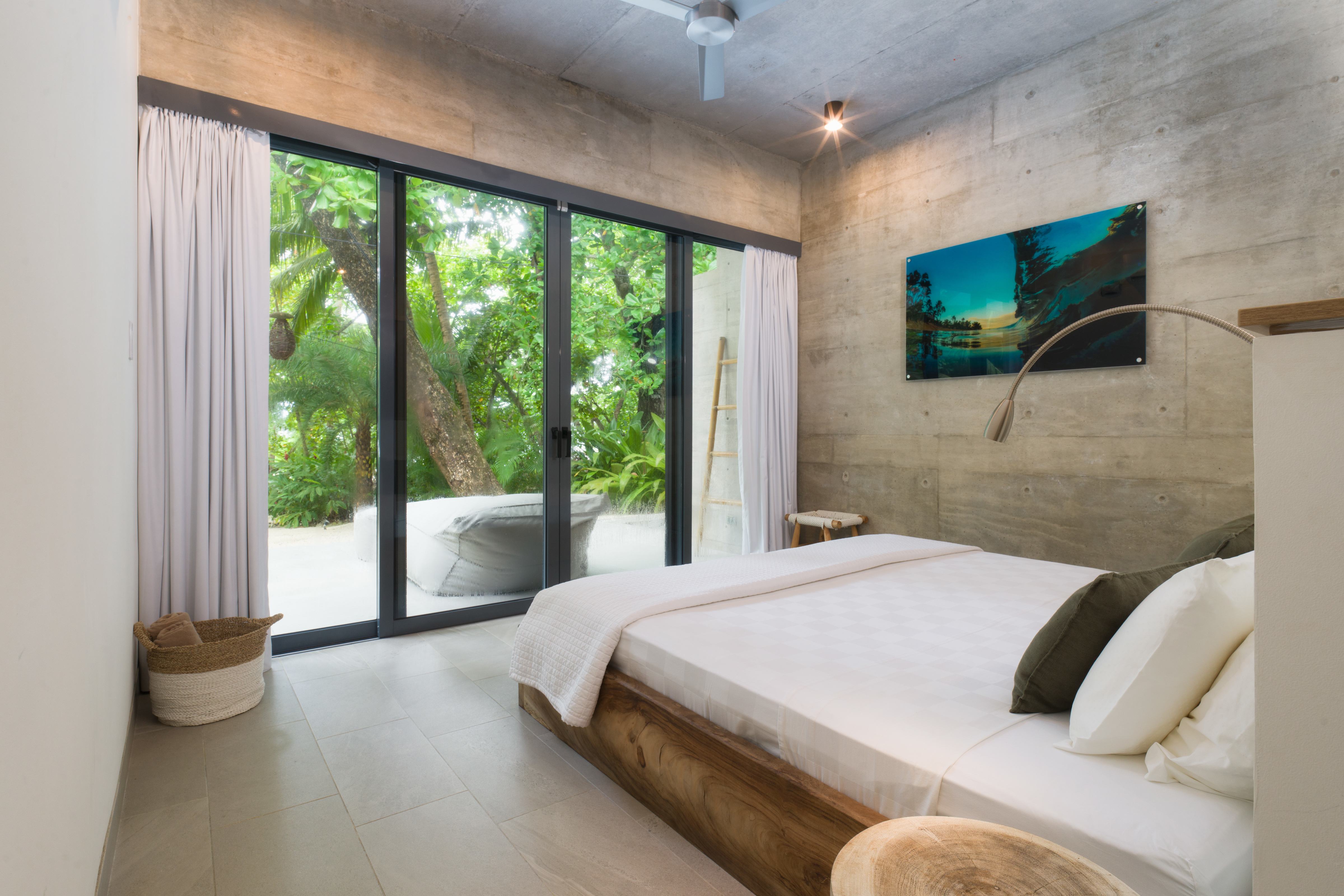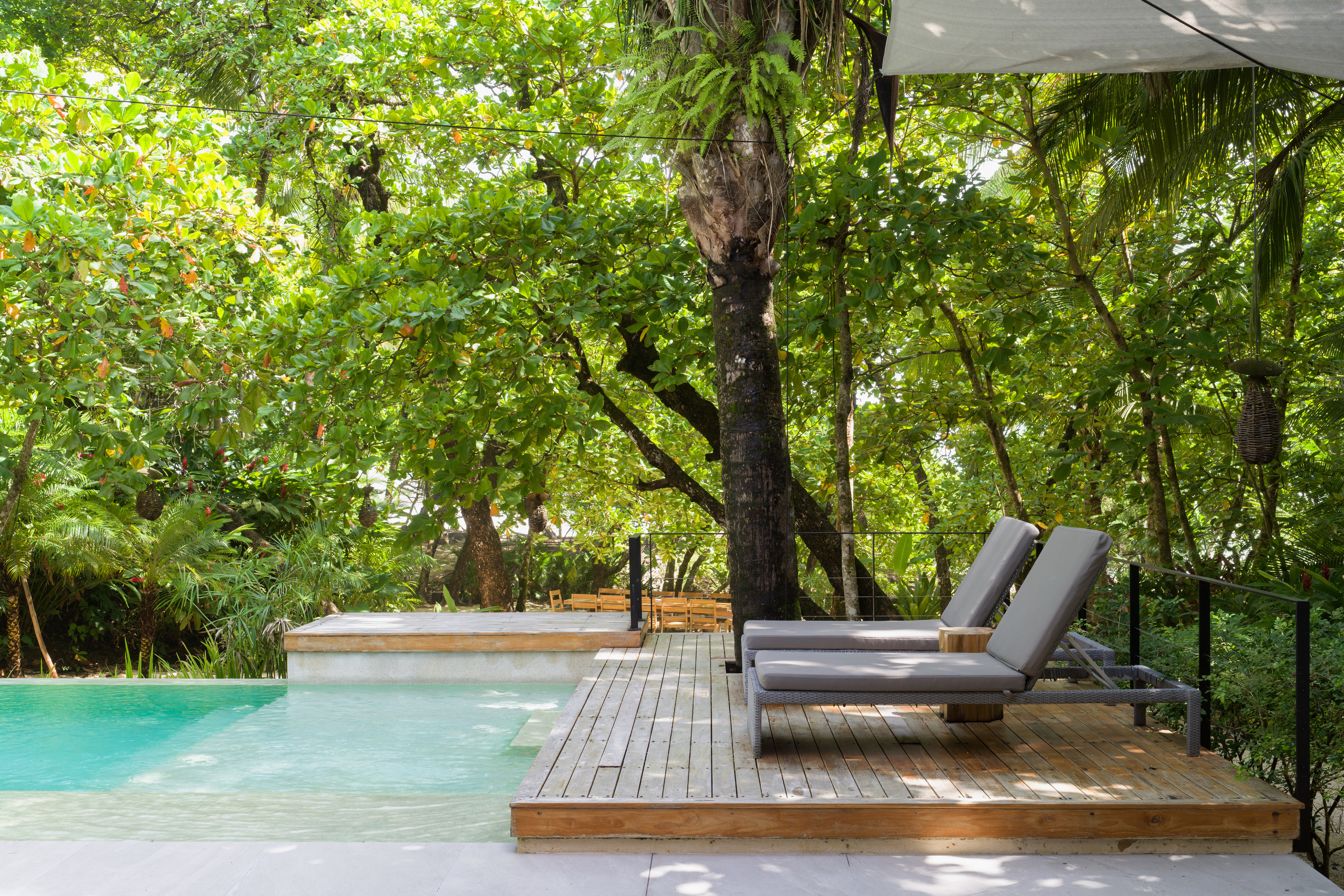 The spacious area between the house and the beach is naturally shaded by native trees and includes lounge chairs and hammocks. There is a large dining table located close to the beach where guests can enjoy cocktails or dinner with an amazing tropical sunset view. The white sand beach in front of North Creek Estate is beautiful. You can relax in full privacy in the shade of numerous trees while watching some fantastic, consistent surf or one of the world’s most beautiful sunsets.