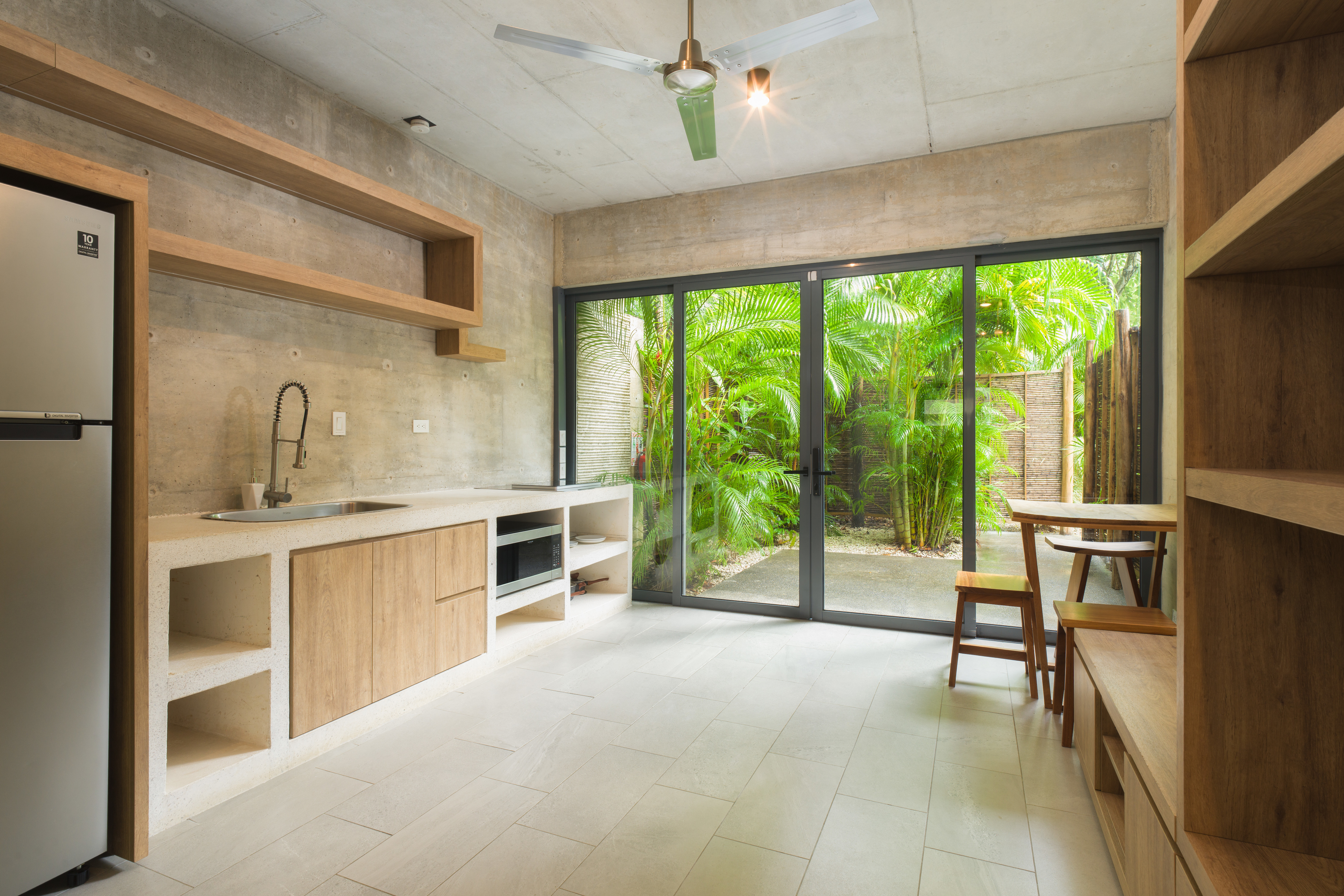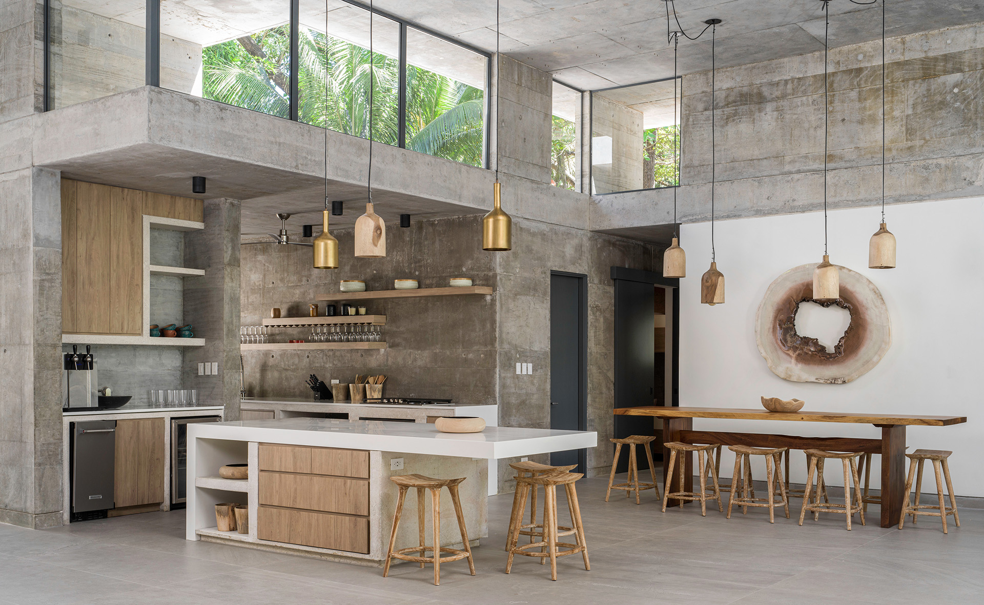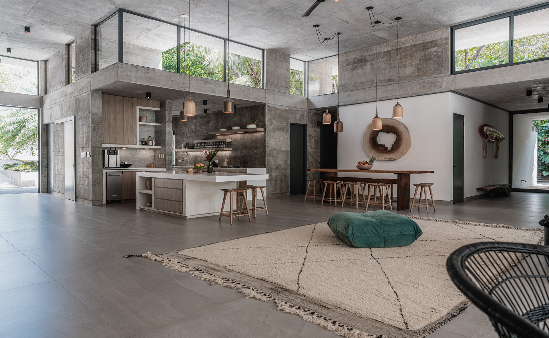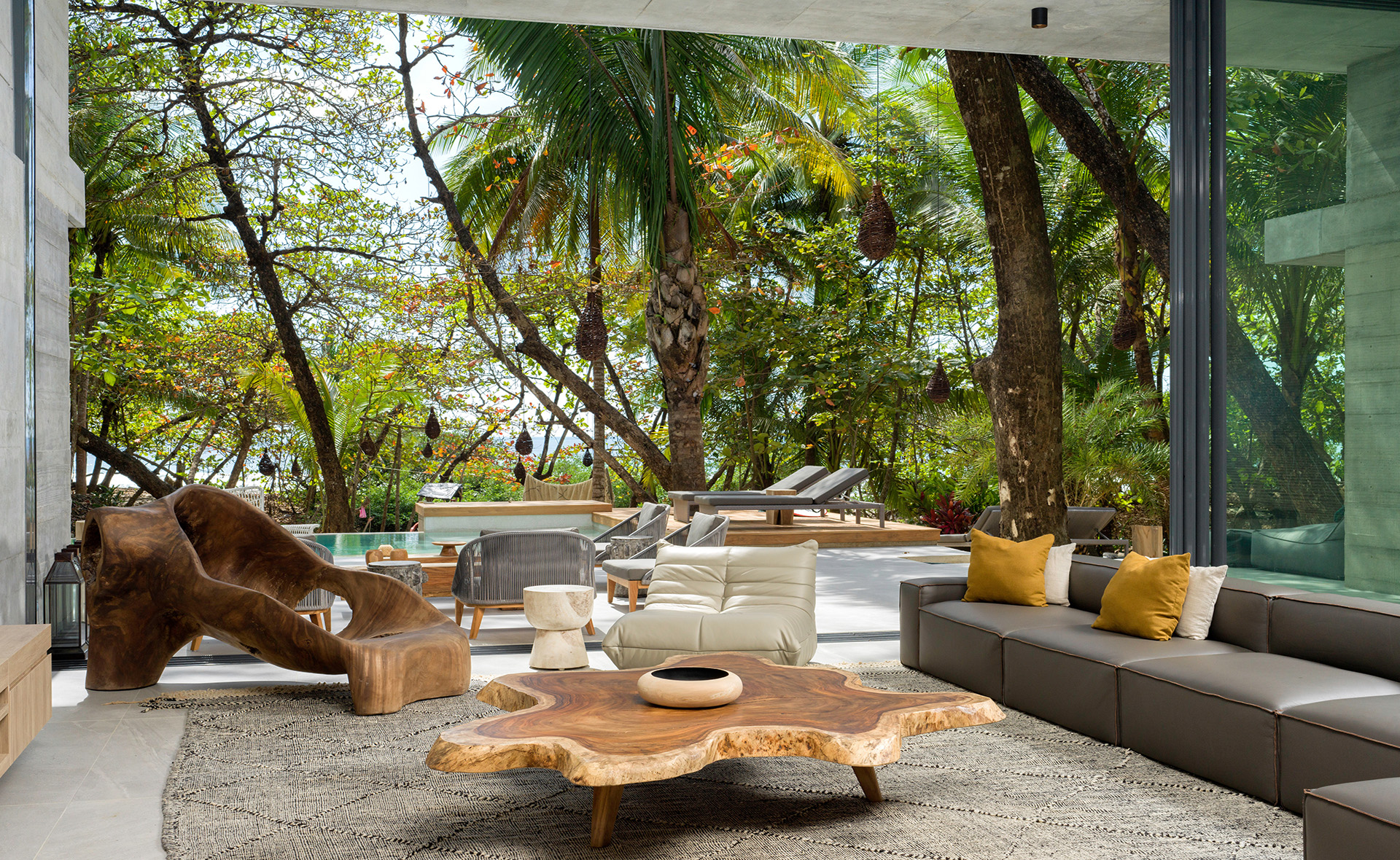 - Spacious living room with high ceilings opens entirely to the terrace and swimming pool area