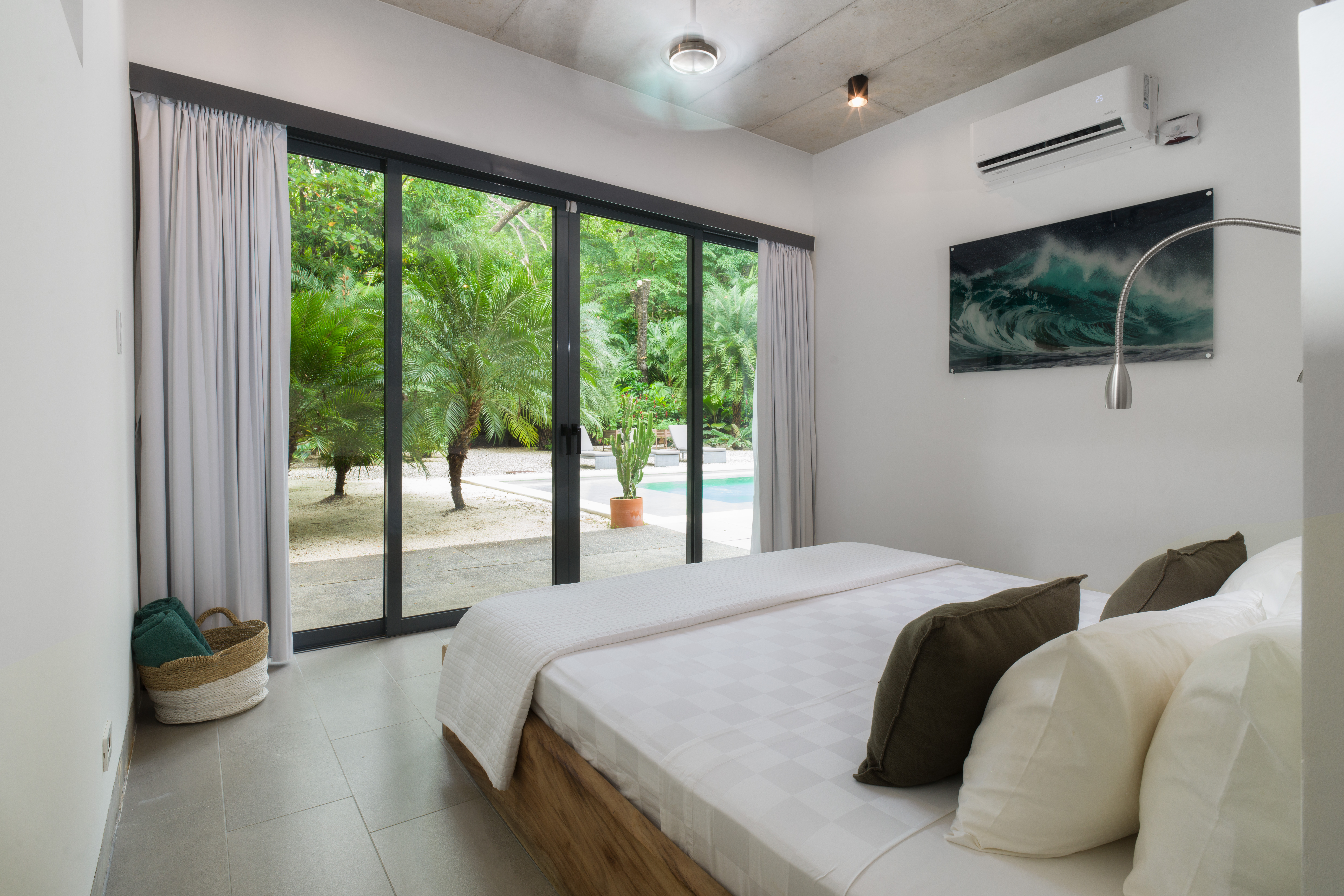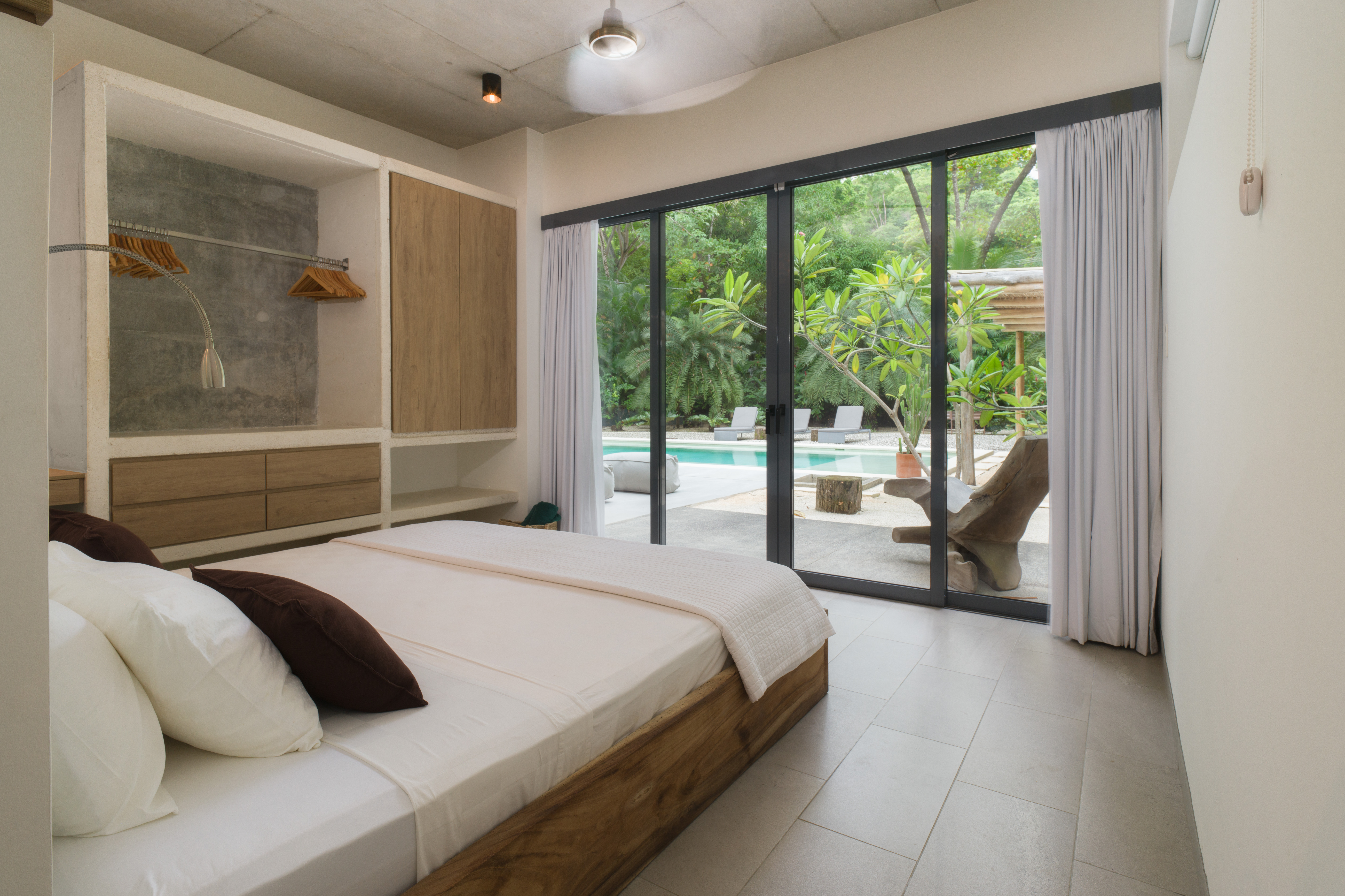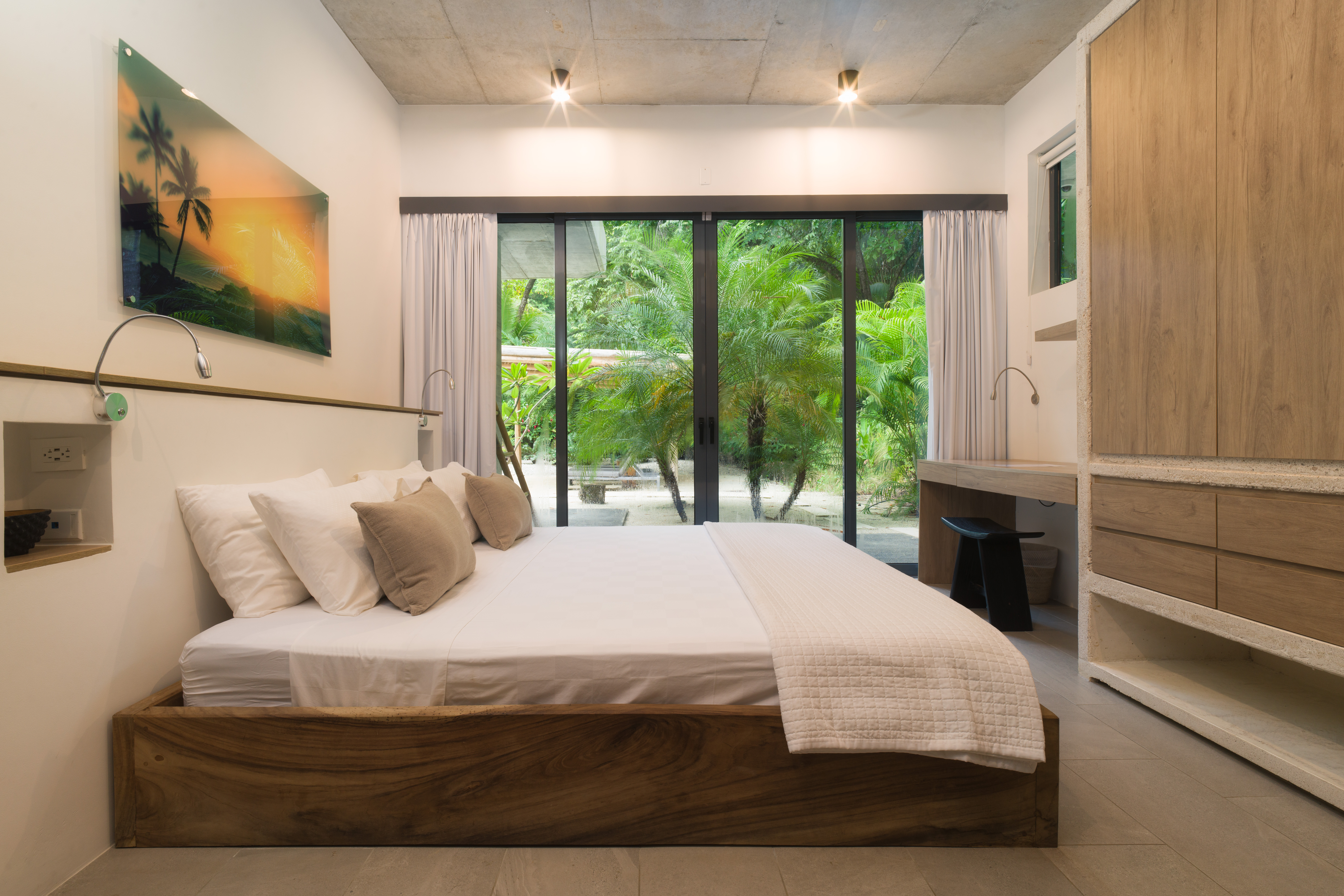 - Three primary bedrooms with pool and garden views, full en-suite bathroom, closet, desk area, and king-size bed