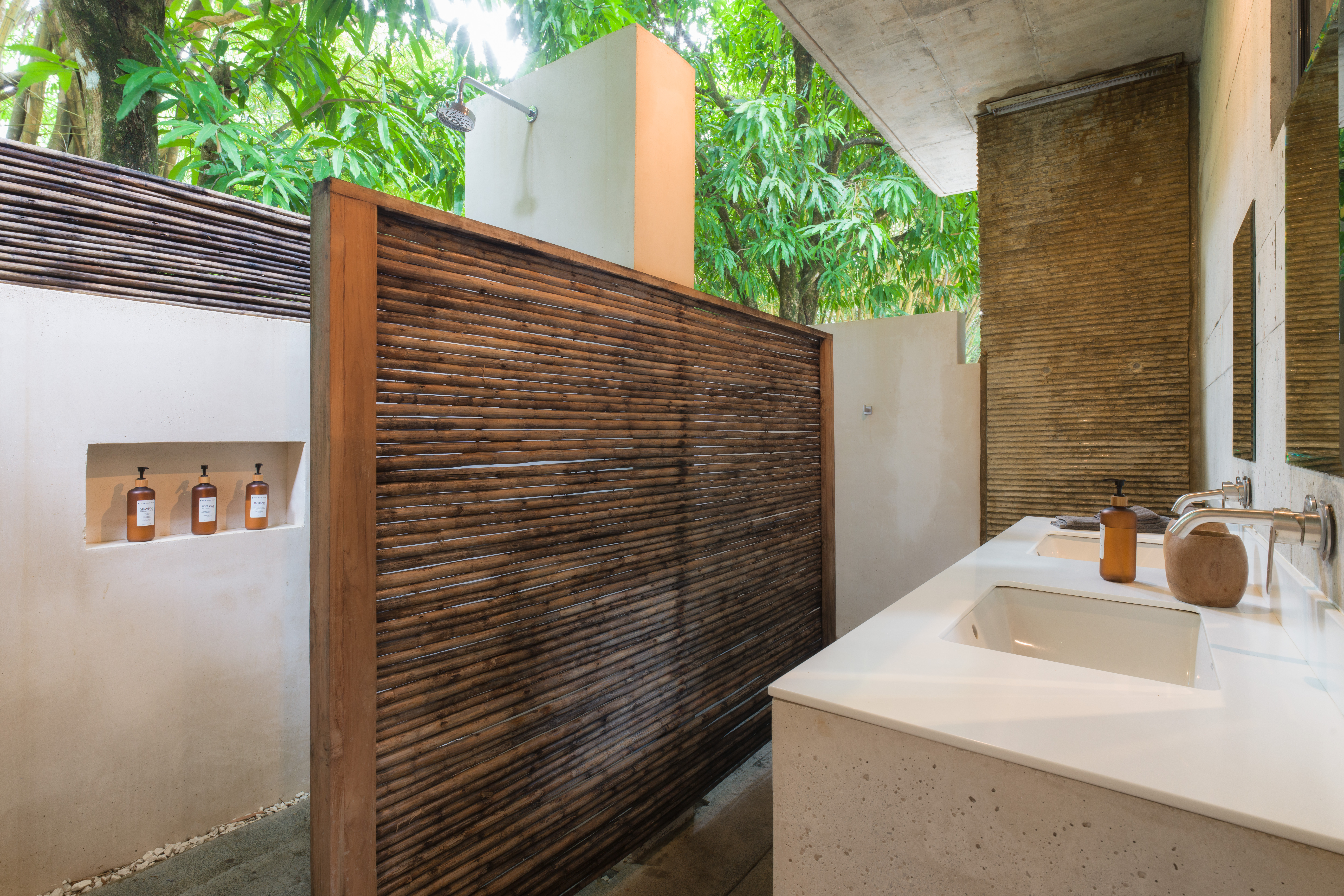 In front of the living room, you can enjoy a pool with shallow hang-out areas surrounded by terraces with several lounge chairs for your tanning and leisure activities. Beyond that, there is a large garden to play in and hang out, with hammocks to relax in the shade. The beach in front of North Creek Estate is stunning, with pristine sand that stretches endlessly. You can relax in full privacy in the shade of numerous trees while watching some fantastic, consistent surf. A private path along a lovely creek leads you from the house to the beach.