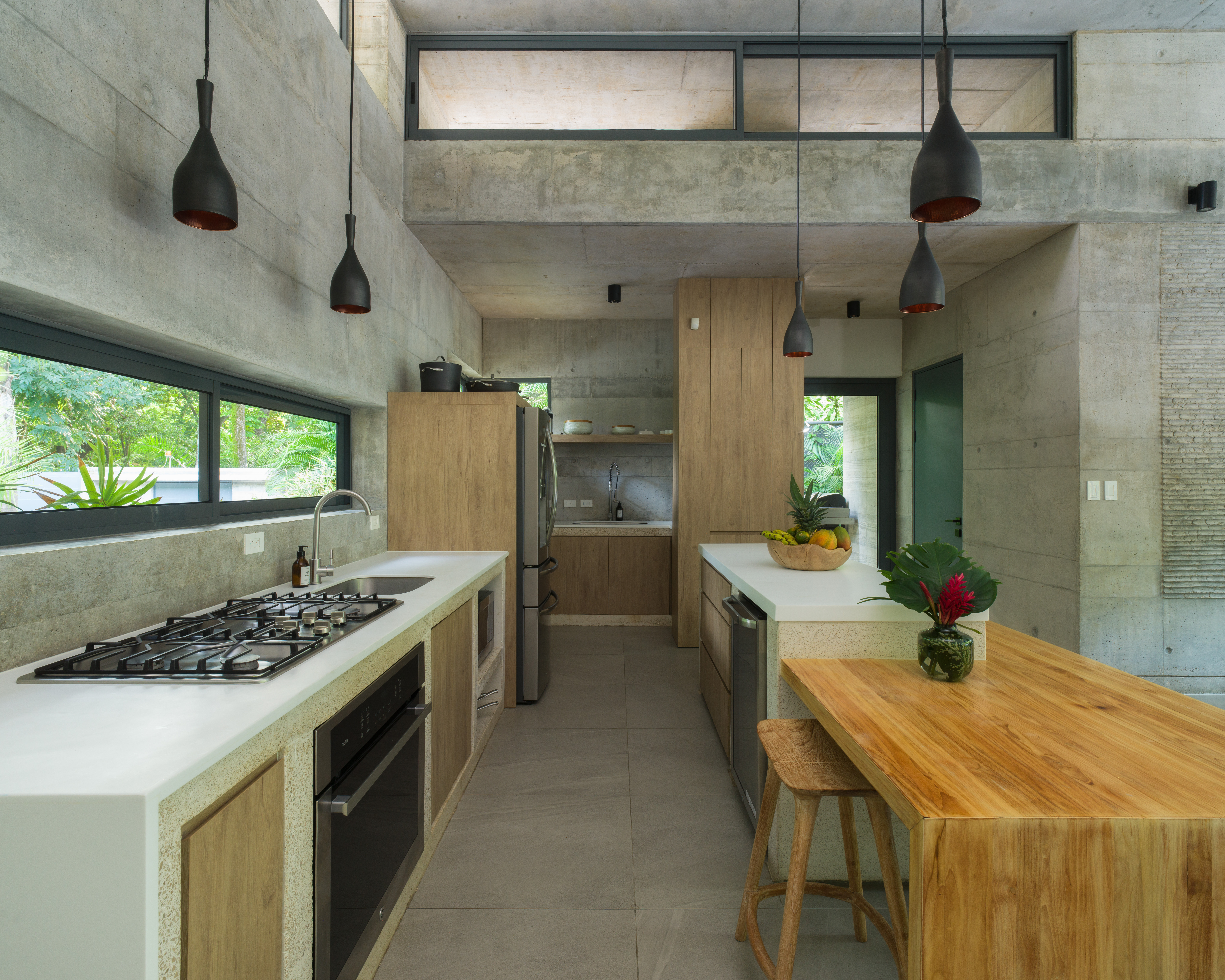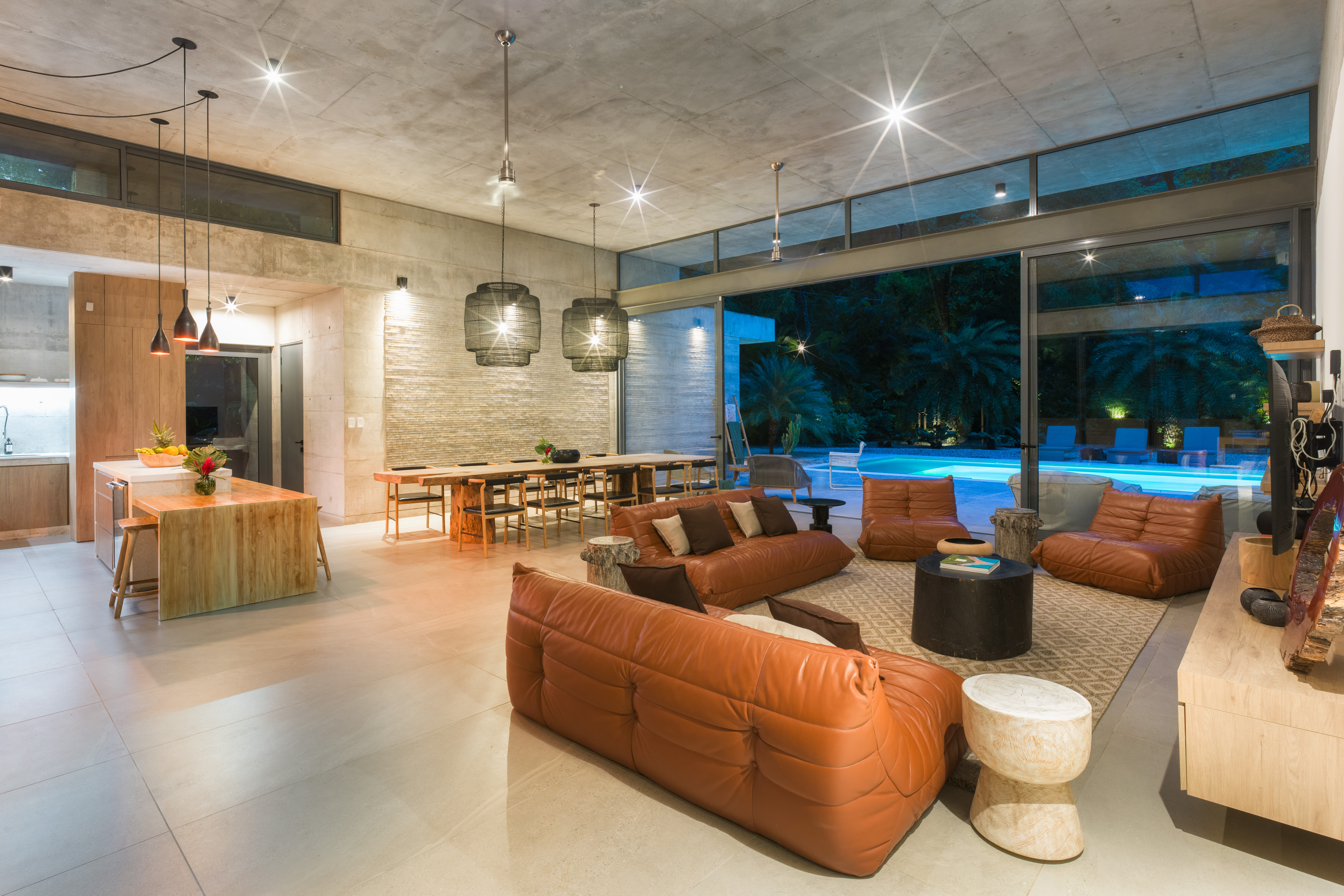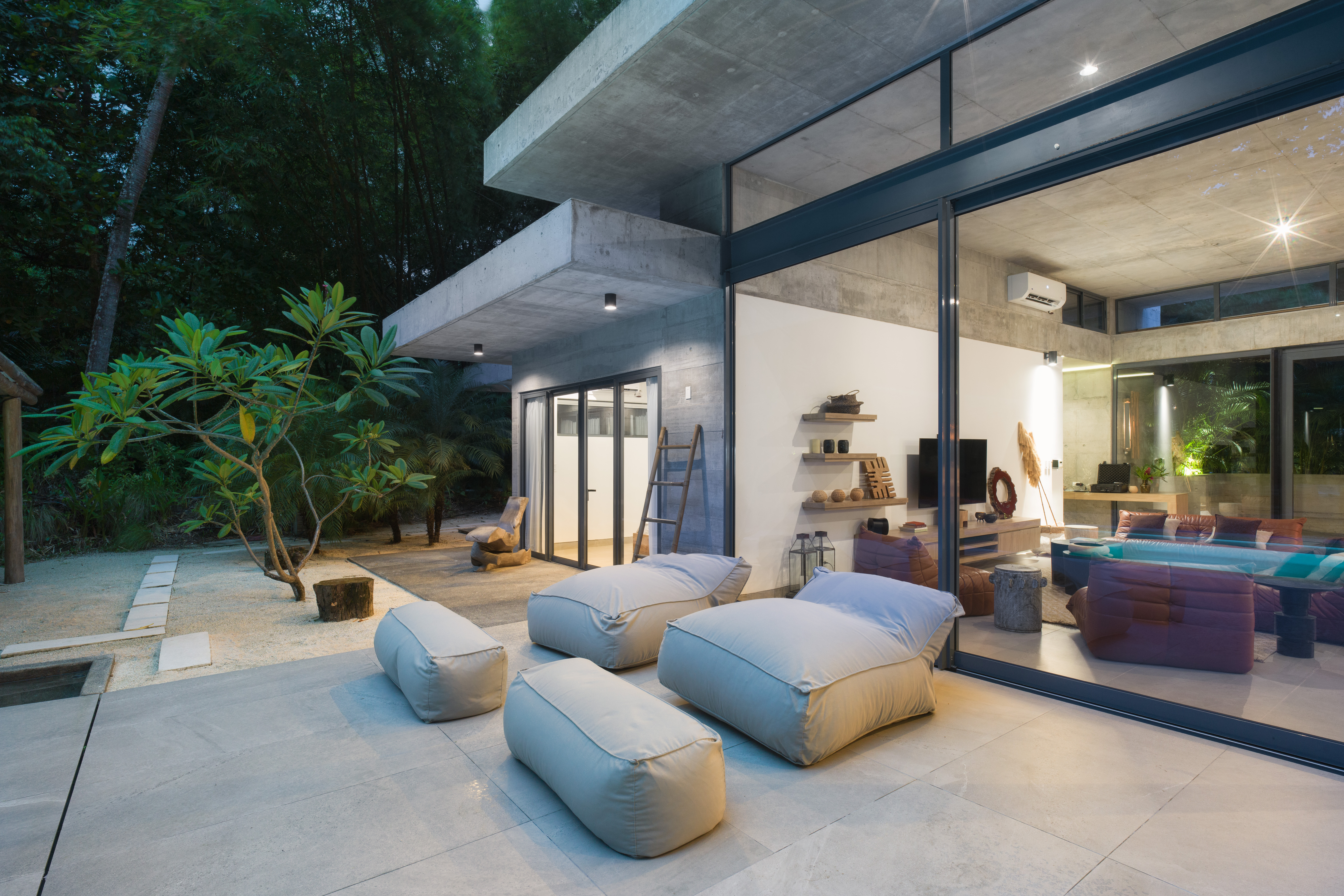 Casa Taman features three master bedrooms with king-size beds overlooking the swimming pool and one children’s bedroom with two bunk beds, accommodating 4 in total. The spacious living areas can be opened towards the swimming pool. The inside living area includes a fully equipped kitchen with bar seating at the island. The dining area consists of a 10-foot-long table that comfortably seats 10 people. Guests can relax in the big, comfortable lounge area in front of a 60” television while looking out towards the pool and jungle.