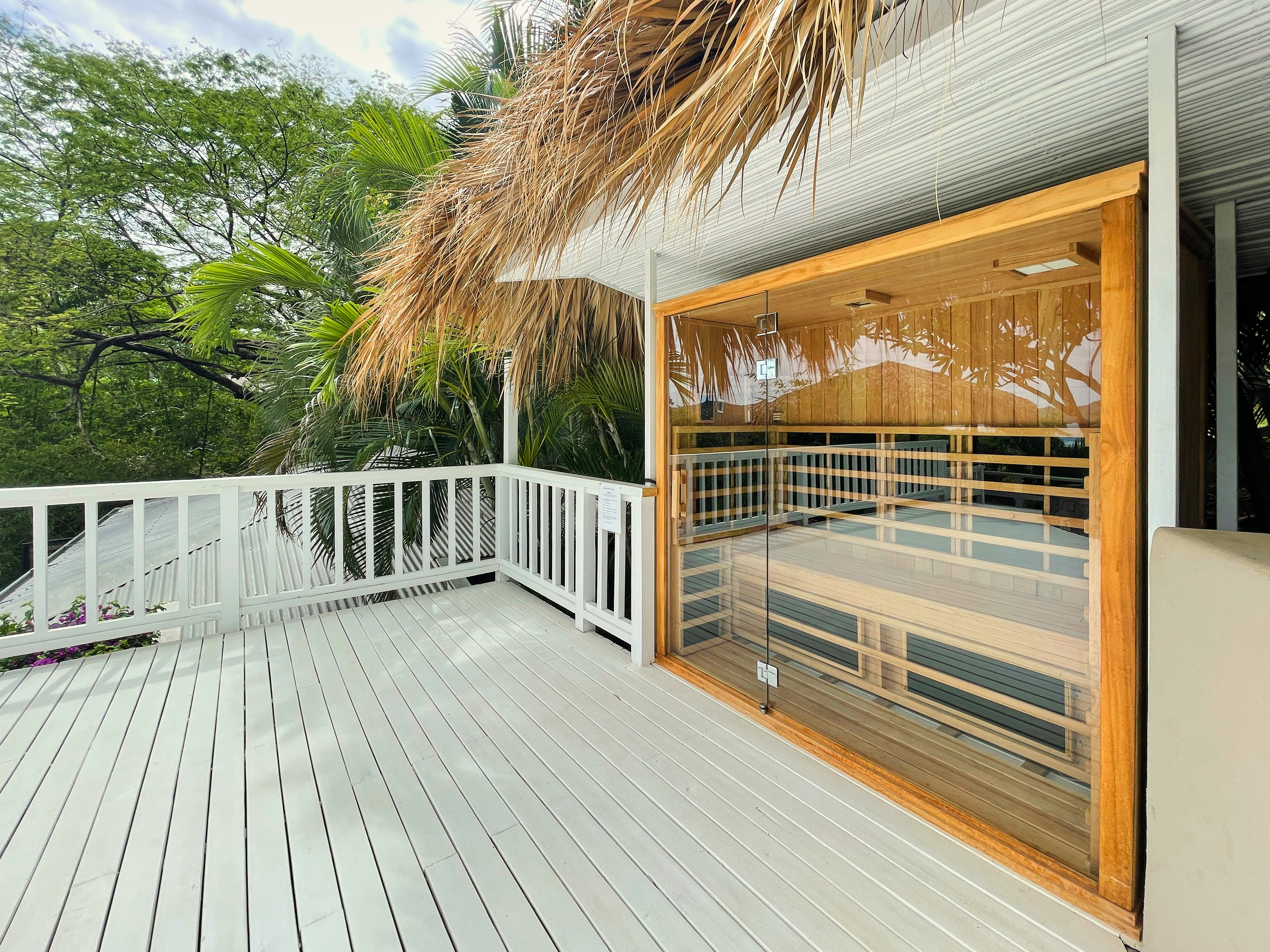 In 2024, we decided to turn Sunset House into the ultimate paradise for wellness travelers, including a small outdoor gym with some weights, an ocean-view sauna, an ocean-view ice bath, a massage/hammock area suspended in the air with ocean-view and an ocean view yoga room with A/C.