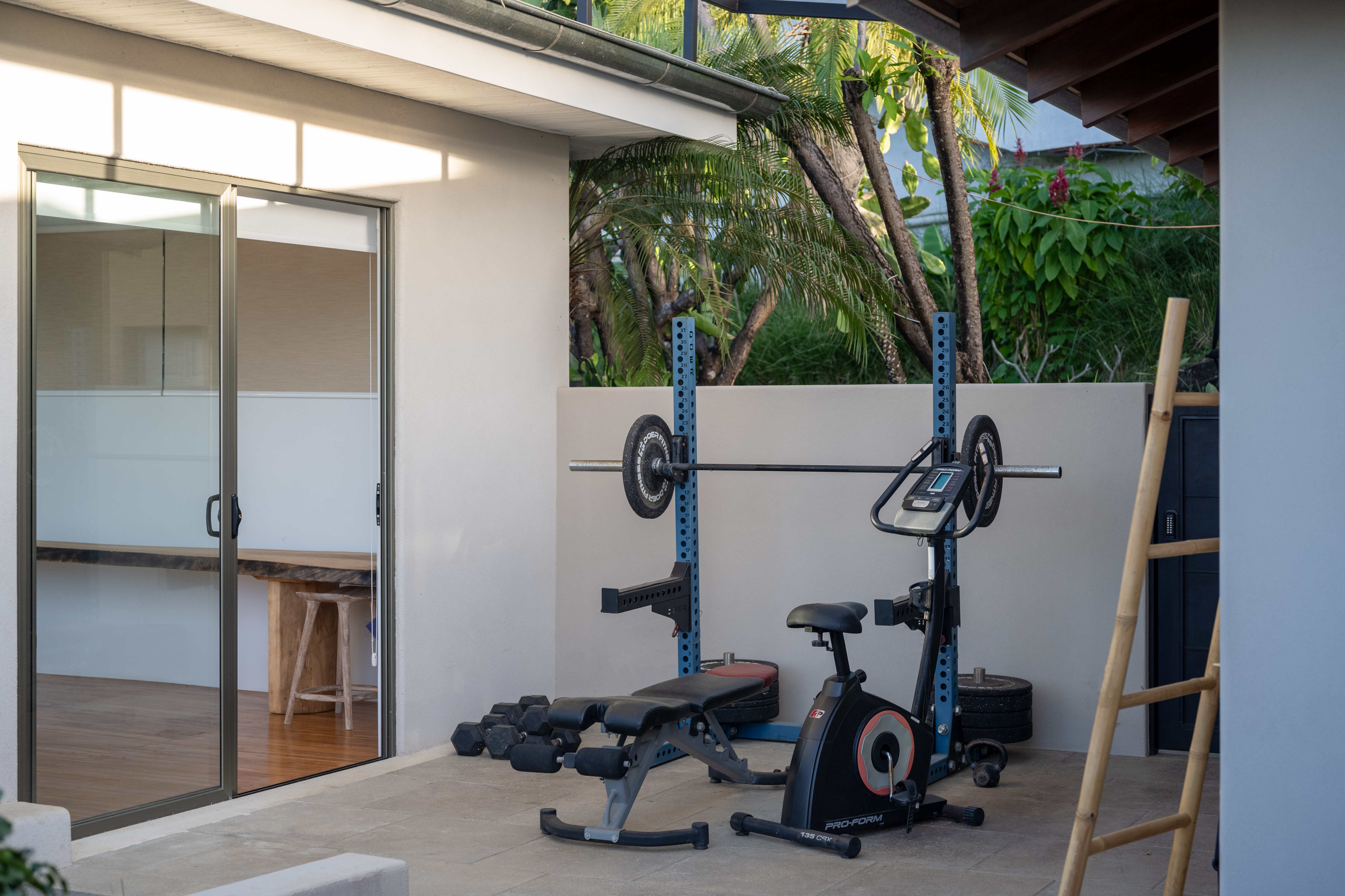- Small outdoor gym area with bench and weights