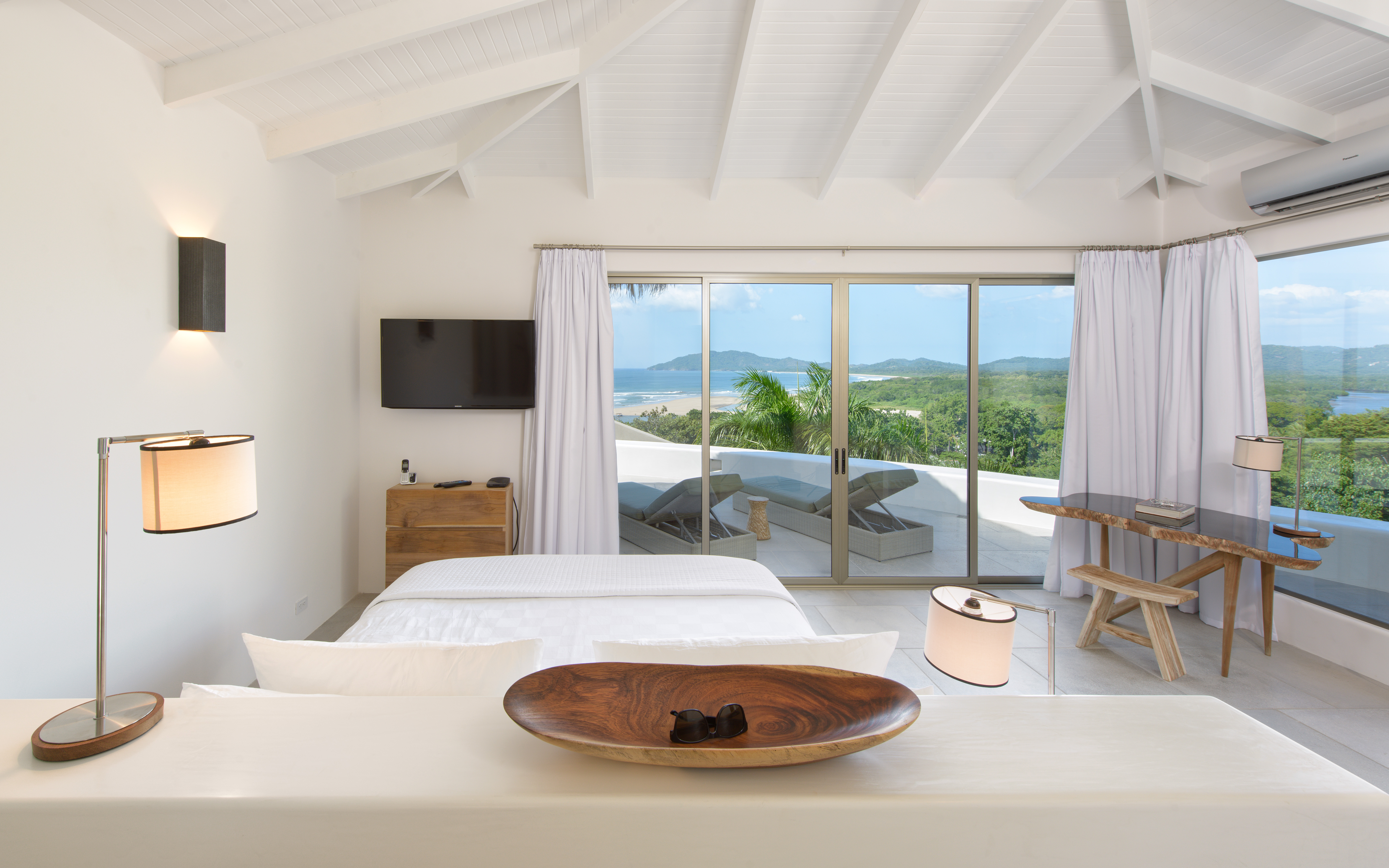 The main bedroom (2) has ocean views and includes a king-size bed, a full ensuite bathroom with double sinks, a desk, and smart TV.