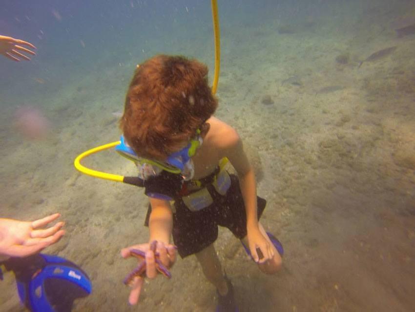 Snuba is a step between snorkeling and scuba diving. No dive license or certification is required to participate in Snuba. The minimum age for Snuba is 5 years old. It is a fun and safe way to experience breathing underwater without having to wear all the equipment. A standard scuba diving air tank is placed in a small, floating raft. Attached to the air tank is a 20ft/6m pressurized air-hose. At the end of the air-hose is a regulator, or a mouth piece that supplies the air. The participant is connected to the regulator with a chest harness, which is what prevents the diver from going deeper than the maximum depth of 20 feet or 6 meters. Basically, you are scuba diving on a leash.